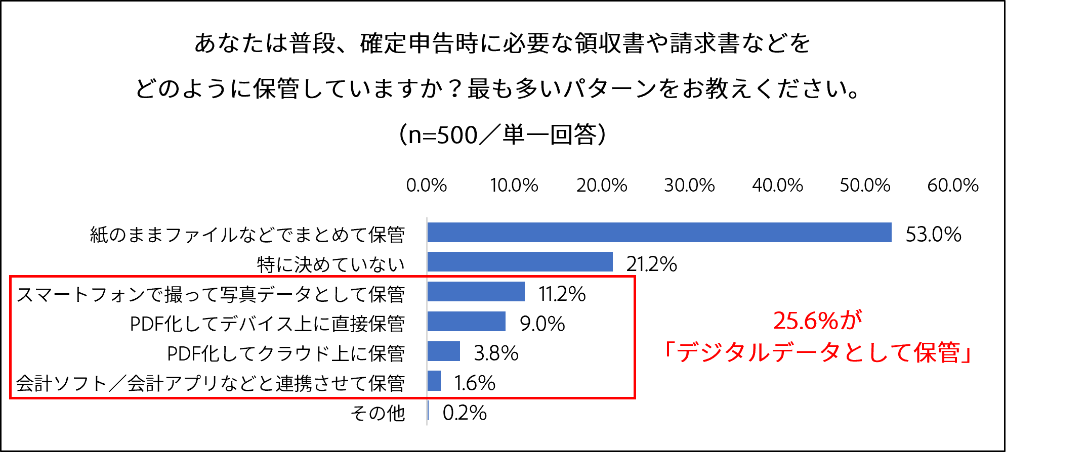 - 確定申告時に必要な帳票の、普段の保管方法は「紙のまま保管(53.0%)」が最多