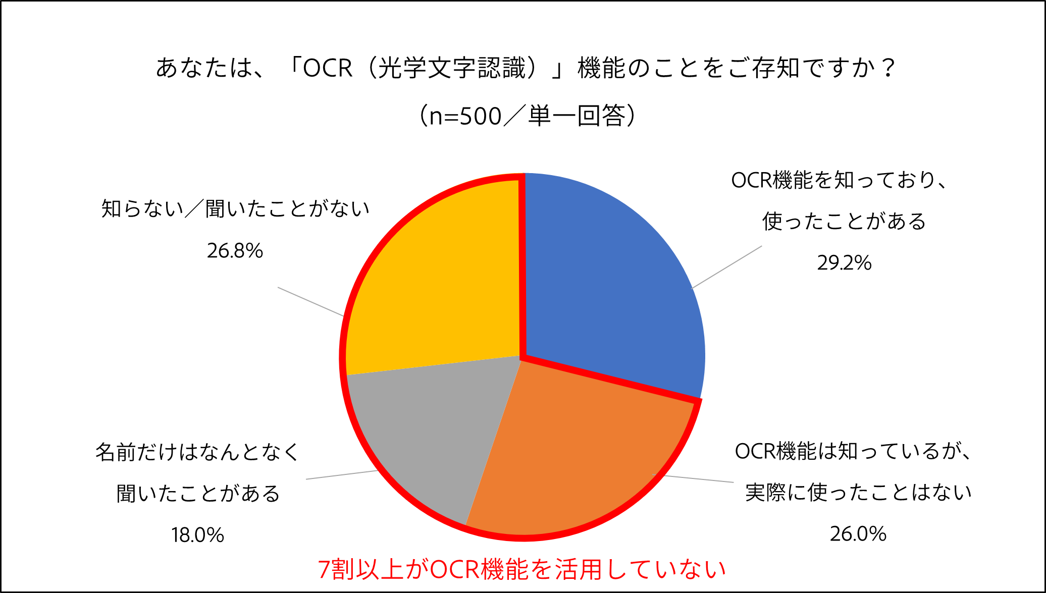 一方で、手書きや印刷された紙文書などをスキャンし、文字データに変換する「OCR(光学文字認識)」機能については、全体の半数以上(55.2%)が「知っている」ものの、「使ったことがある」と回答したのは全体の29.2%となりました。「知っているが使ったことはない」が26.0%、「名前だけは聞いたことがある」が18.0%、「知らない/聞いたことがない」が26.8%と、7割以上がOCR機能を活用していない結果となりました。