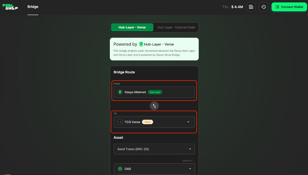 実際にNFTを購入して頂く前に、お持ちの$OASをOasys HubのMy AssetsでHub LayerからTCG Verseにブリッジして頂く必要がございます。