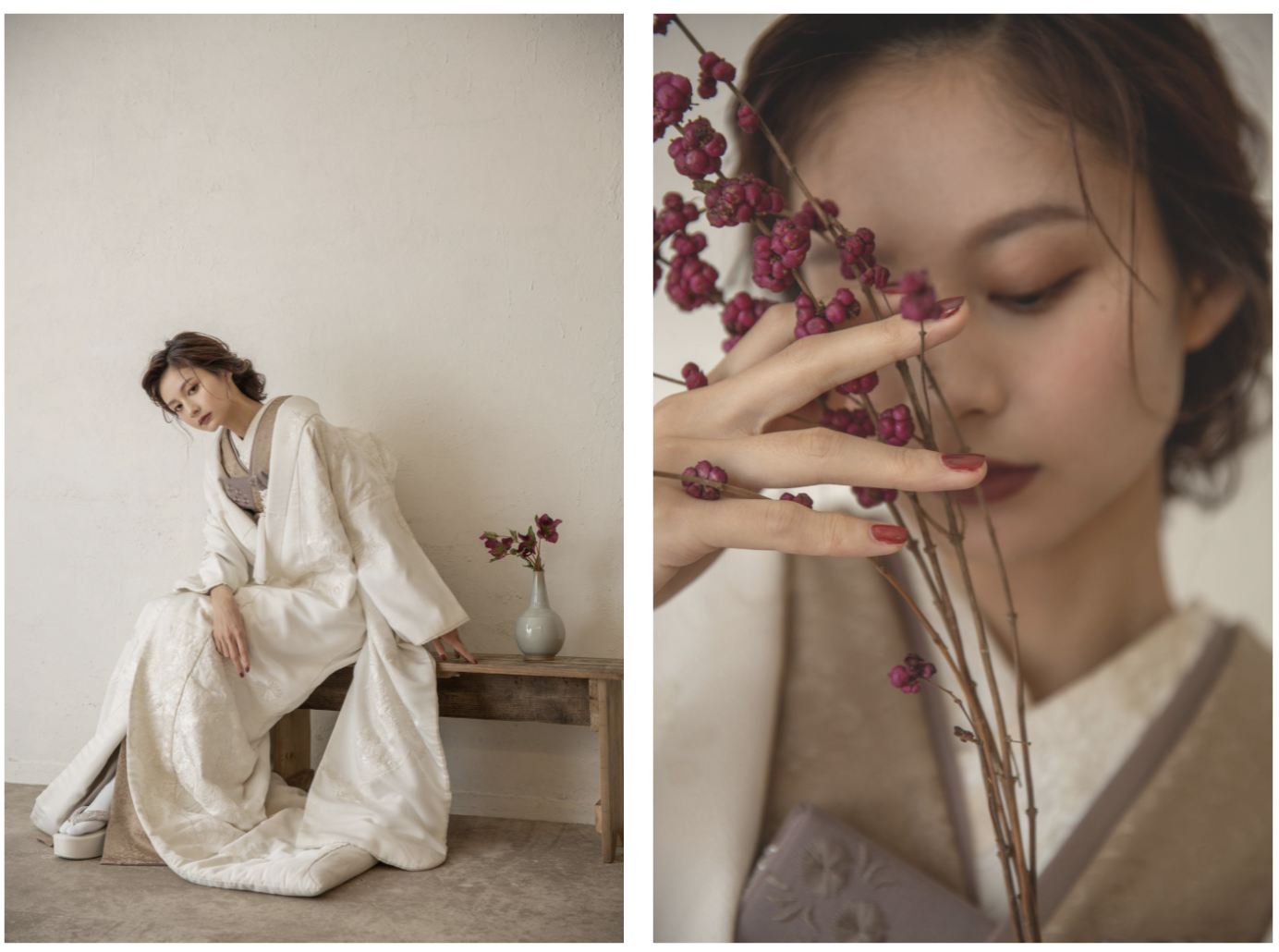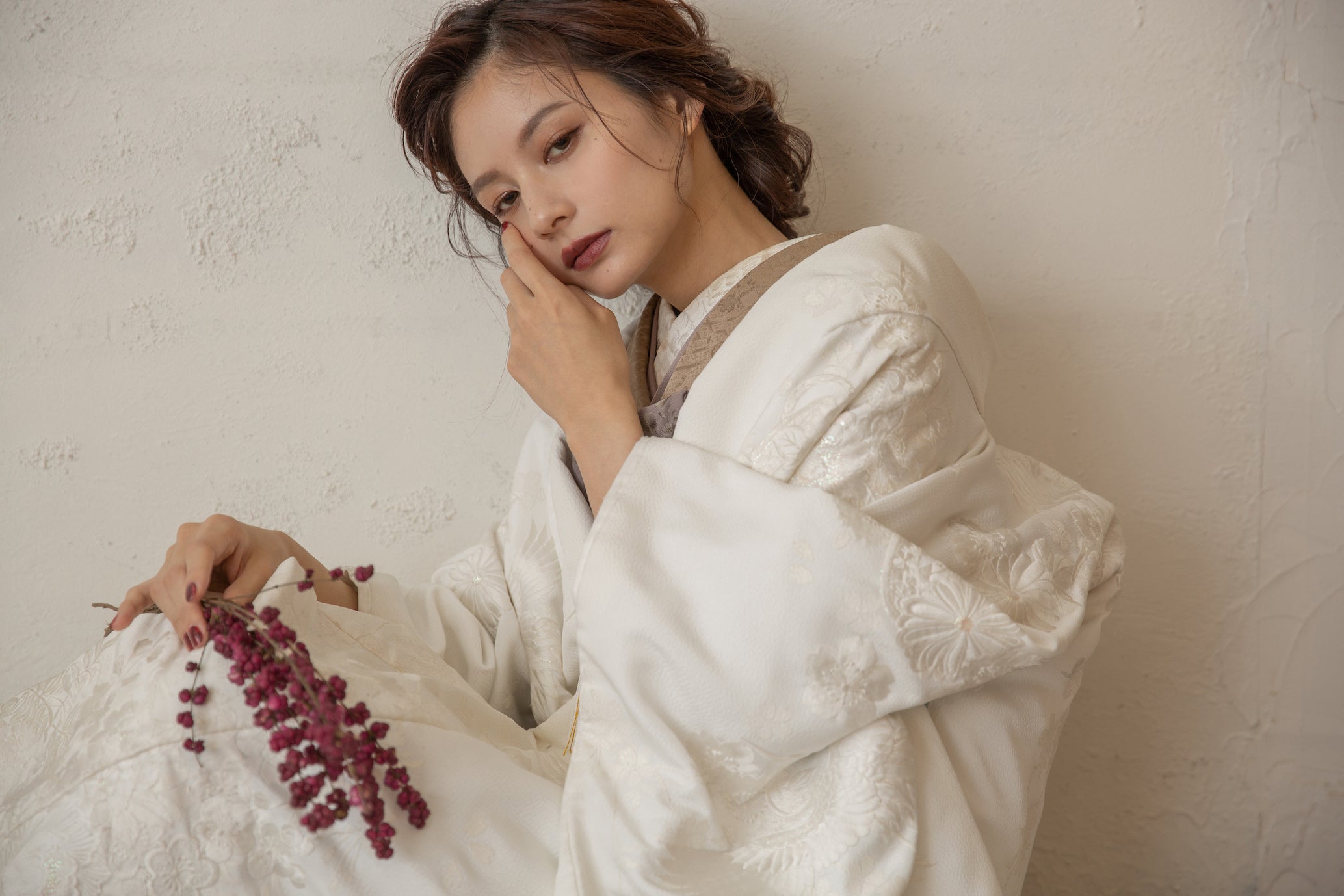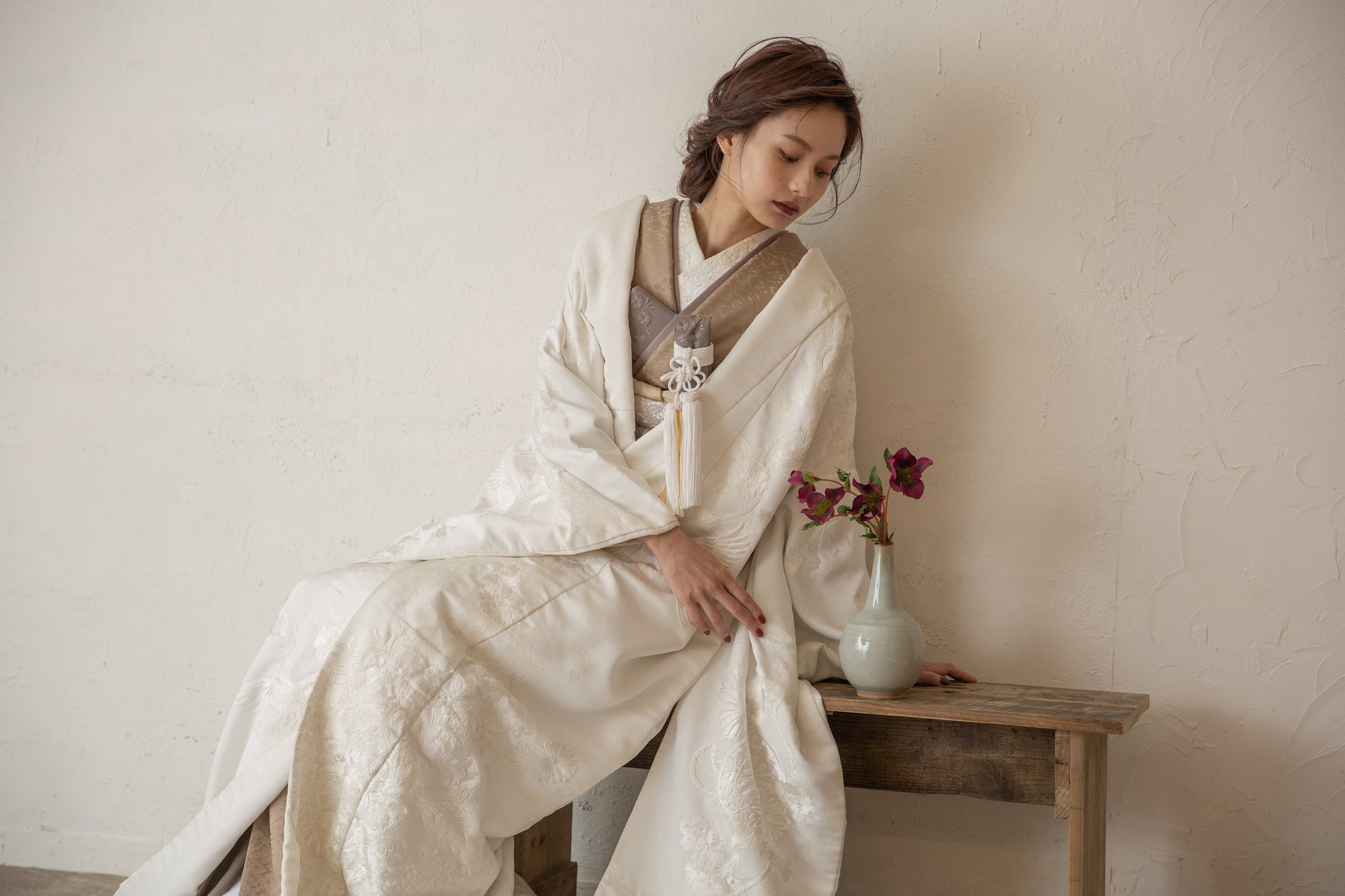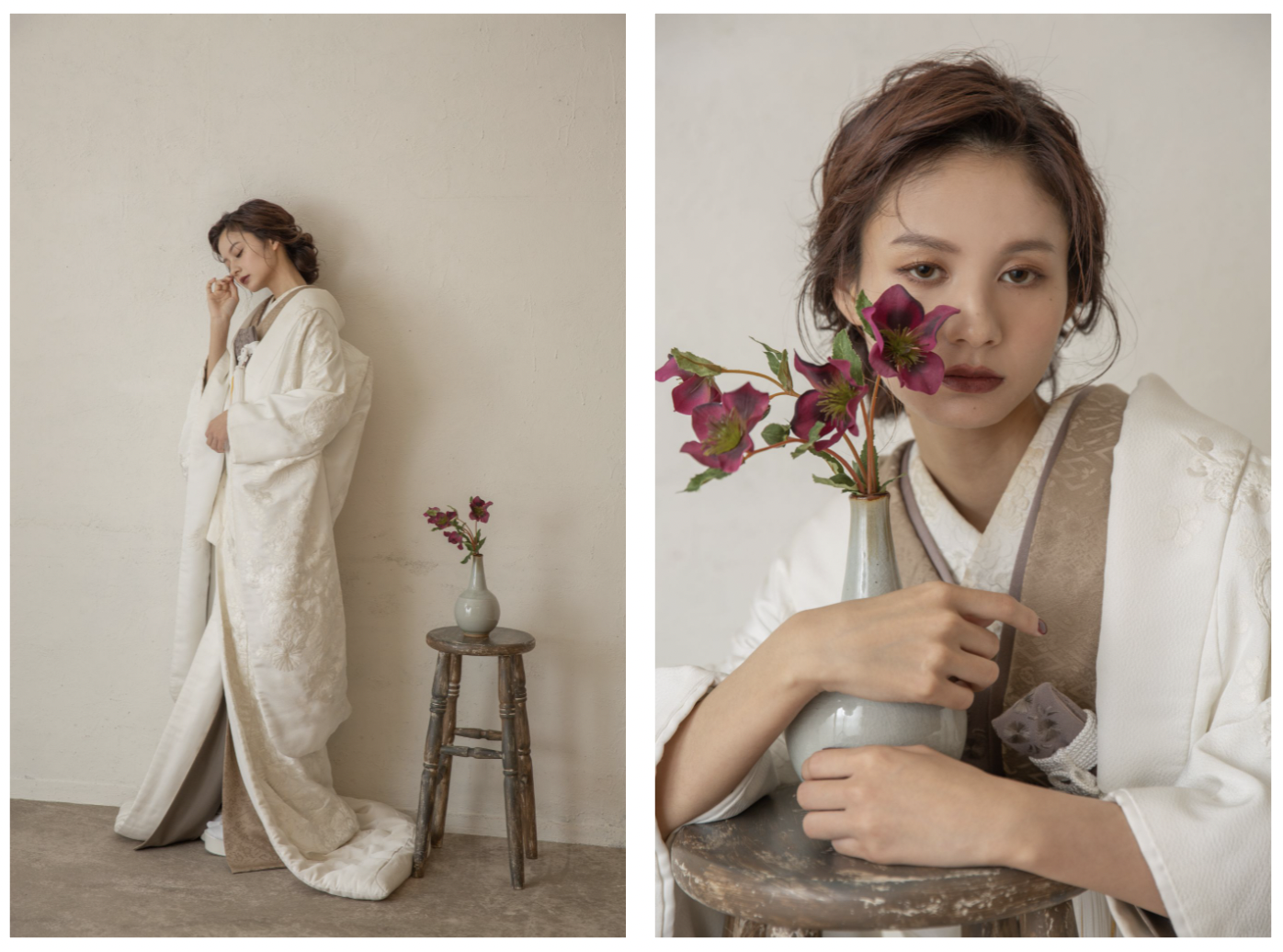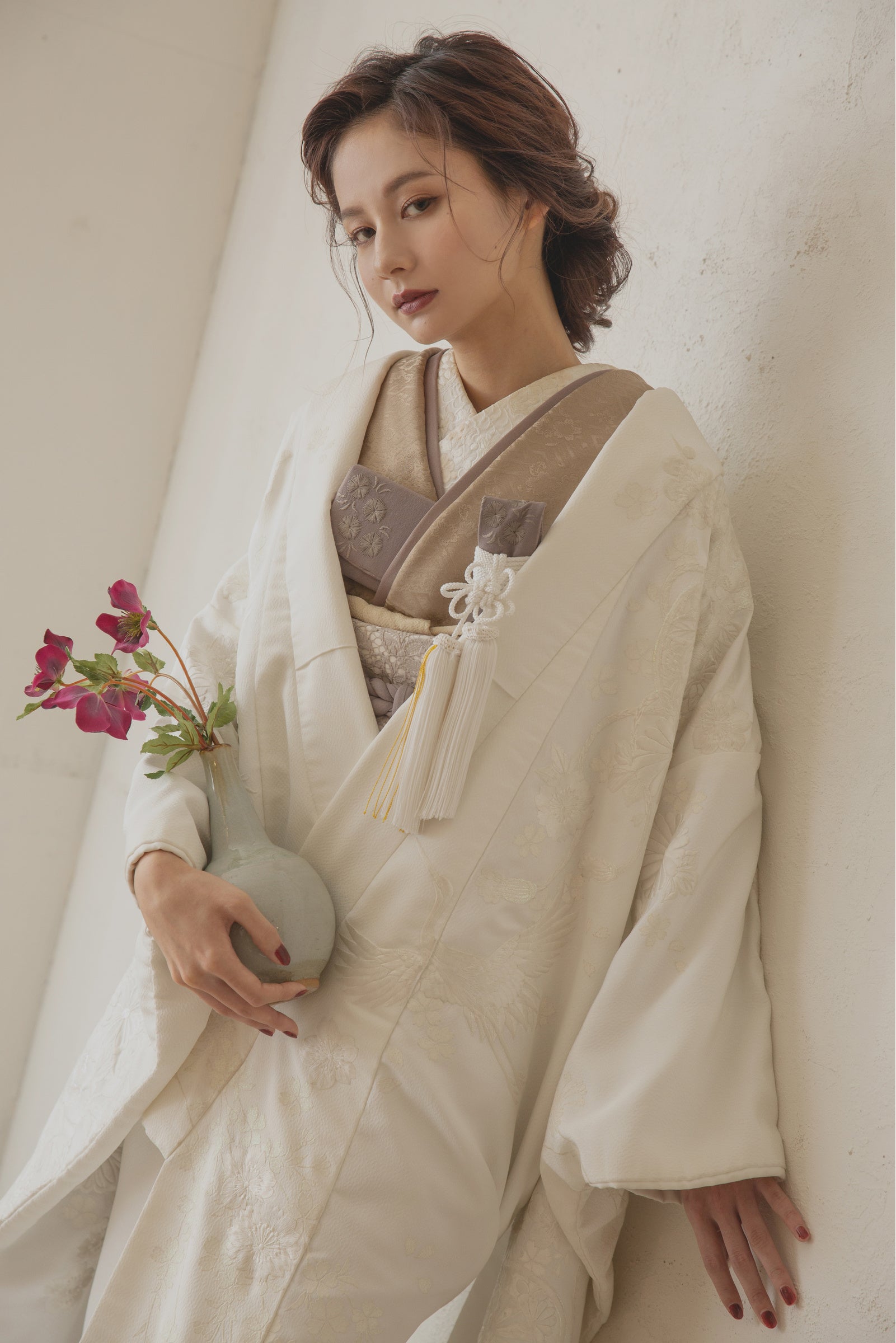 今回は、洗練された白無垢に、琥珀色の色掛下とくすみグレーの小物を合わせ、シックモダンな和装スタイル。