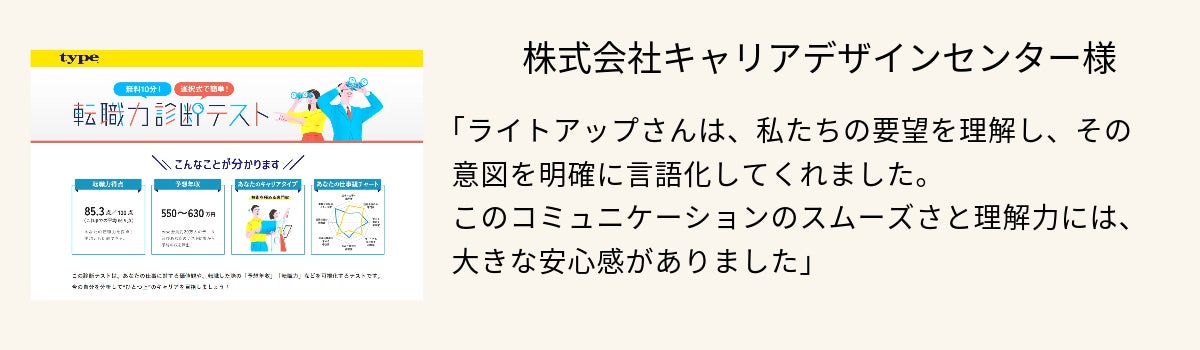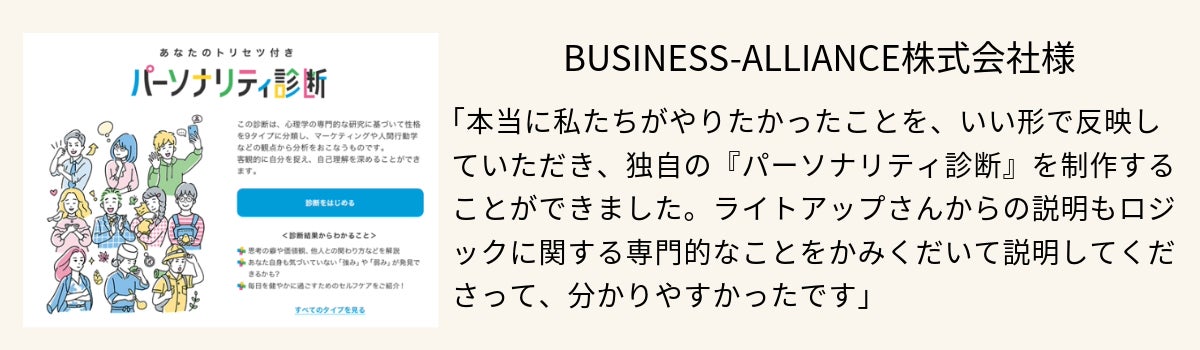 これまでエンタメ要素の強かった診断コンテンツが、より実用的な課題解決に利用されるようになりました。こうしたご要望にお応えできるのは、学術的なロジックに基づいて診断コンテンツを受託制作してきたライトアップならではの強みです。