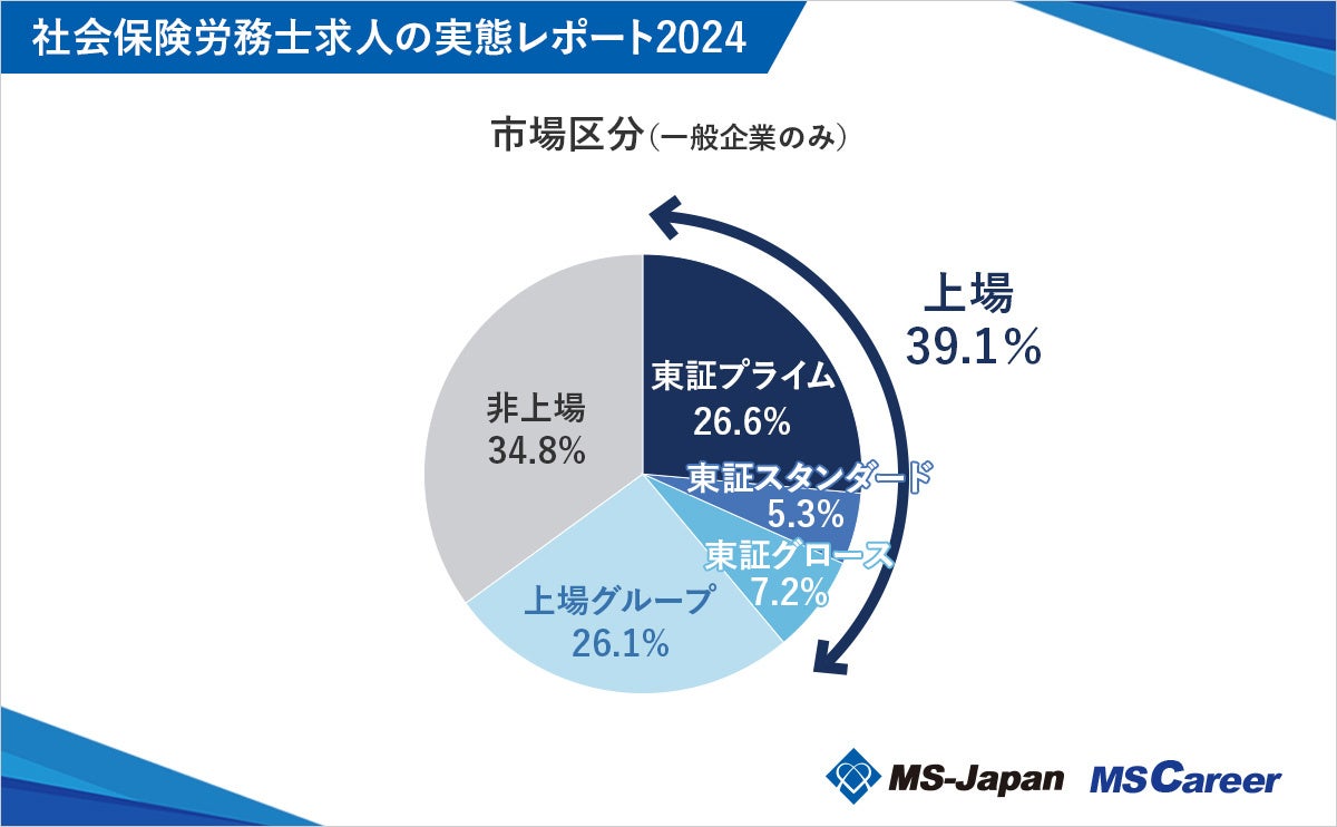 一般企業において、市場区分別の企業内訳を調査したところ、「東証プライム」は26.6%、「東証スタンダード」は5.3%、「東証グロース」は7.2%と全体の39.1%を上場企業が占めていました。