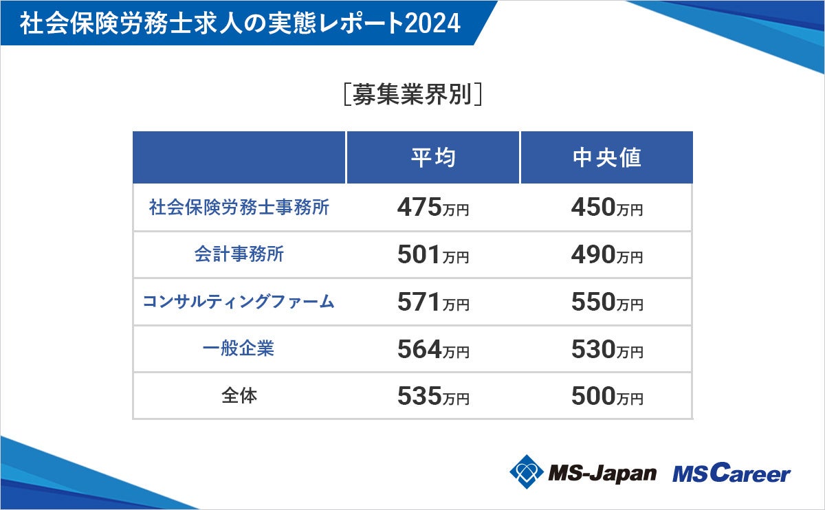 全体の平均値は535万円、中央値は500万円であり、業種別では「コンサルティングファーム」や「一般企業」が比較的高い傾向が見られました。