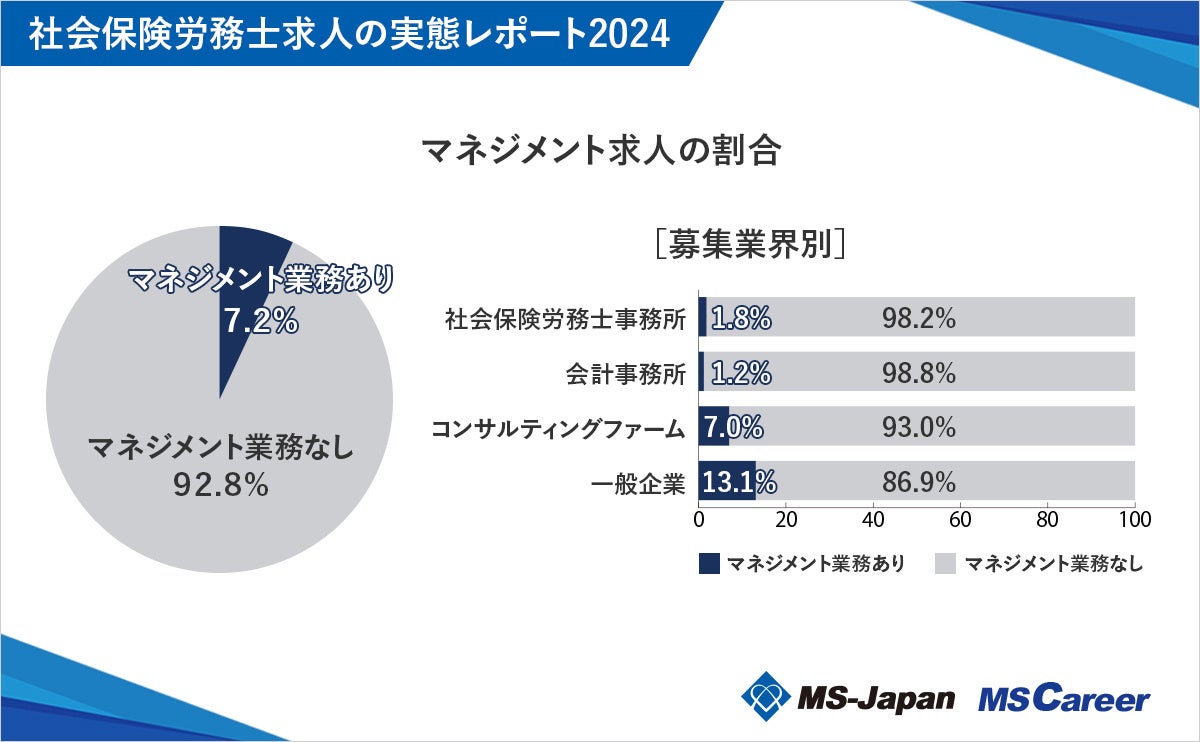入社後すぐマネジメント業務を想定している社労士求人は、全体の7.2%でした。「一般企業」は13.1%と他の業界よりも多いです。