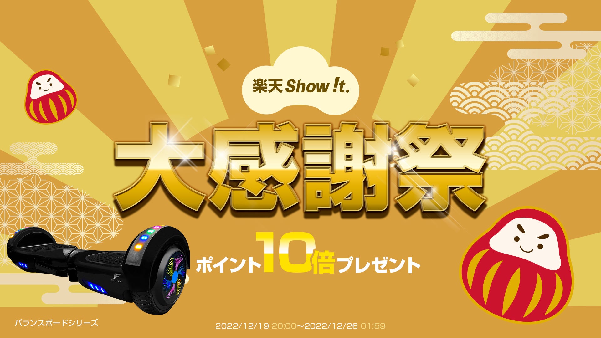 楽天市場「Show !t」は12月19日(月)20時~12月26日(月)01時59分まで、ポイント10倍プレゼント(一部商品を除く)・全商品送料無料の楽天大感謝祭に参加します。また、MESTER.F電動バランスボードご購入で、12,000円相当の収納バックとヘルメットもしくは、キッズプロテクターのセットをプレゼントするキャンペーンを実施。さらに、楽天大感謝祭特典としてMEISTER.Fオリジナル防水バッグをプレゼント。