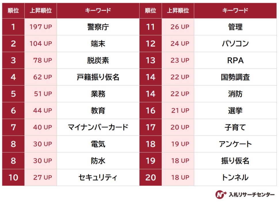 ・入札情報速報サービス NJSS ユーザーが検索したキーワードを元に、前月と比較して上昇幅の大きいキーワードをランキング