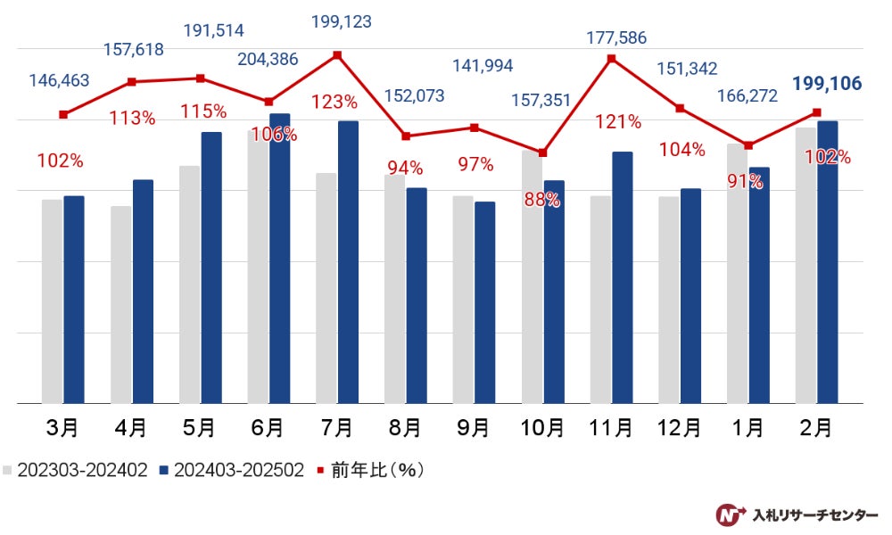 2025年2月の公示案件数は総計199,106件で、前年同月比102%となりました。