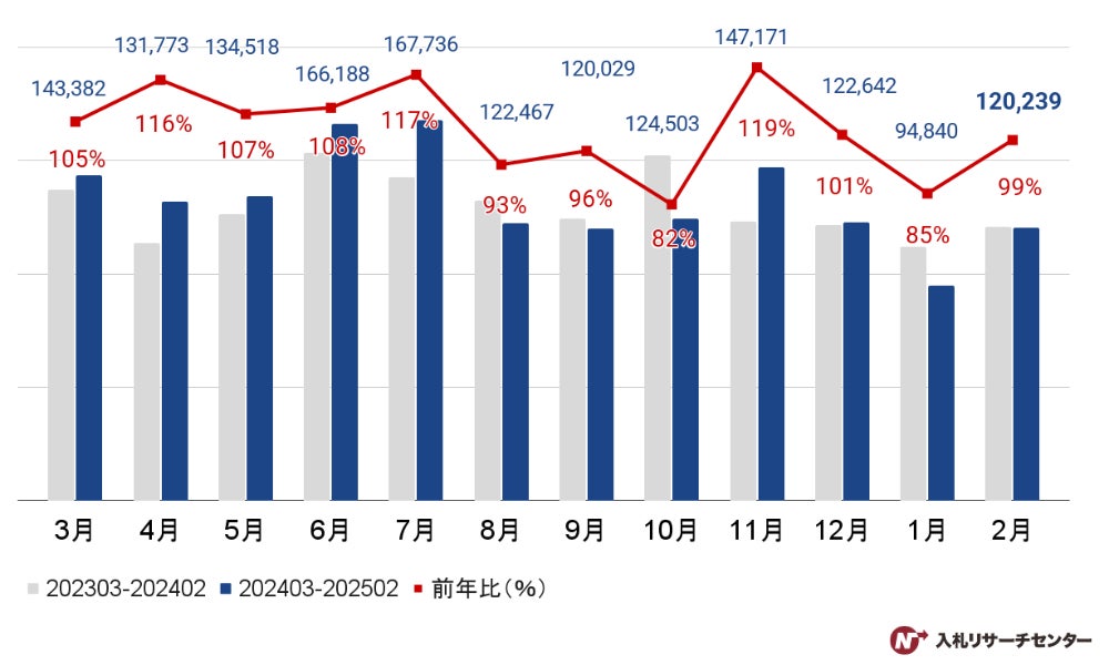 2025年2月の落札案件数の総計は120,239件で、前年同月比99%となりました。