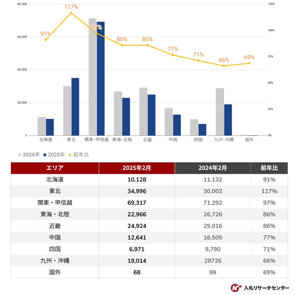 2025年2月のエリア別公示案件数は、東北エリアのみが前年比117%と増加し、その他のエリアは減少傾向となりました。