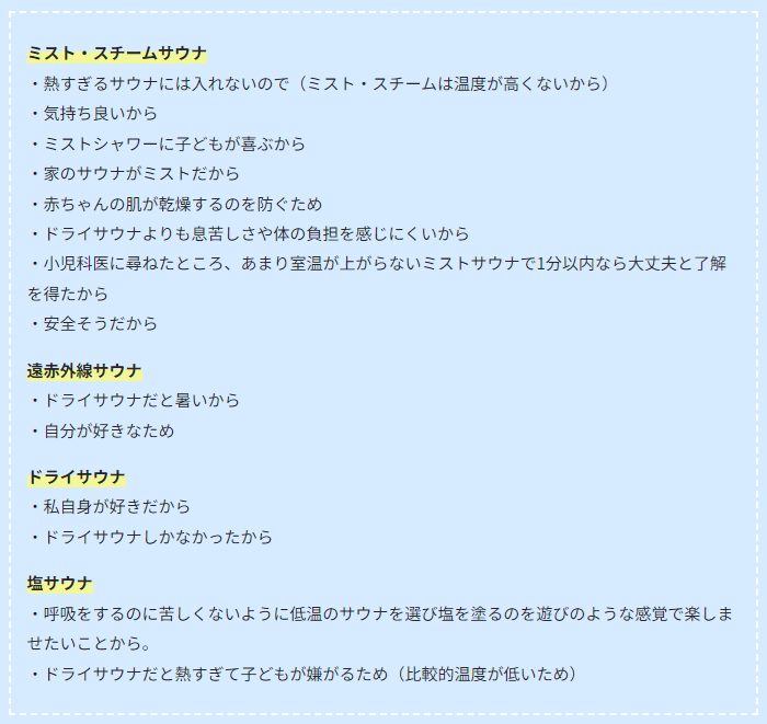 アンケートの回答にもあるように、実際にミストサウナや遠赤外線サウナ、塩サウナはドライサウナに比べて低温に設定されているため、お子様また高齢者などにも身体への負担が少ないとされています。特にミストサウナは、多湿で息苦しさも感じにくいため、まだ体の機能が未発達なお子様には丁度良いと言えるでしょう。
