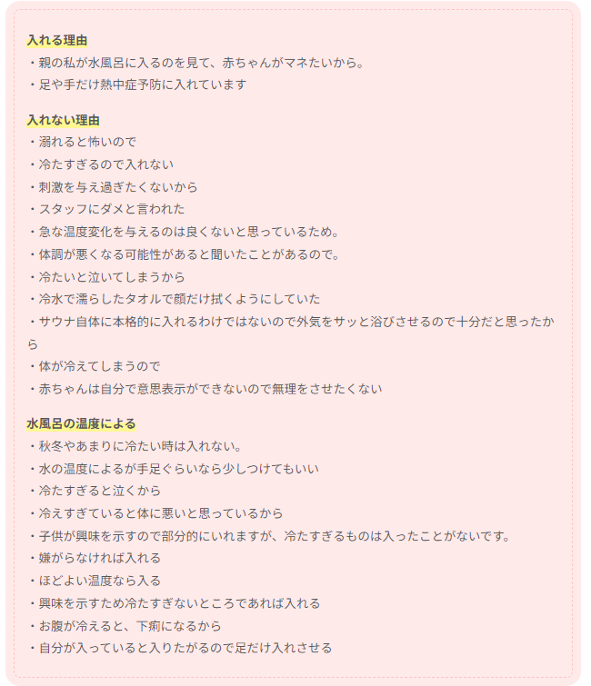 水風呂に関しては、これも回答者の声にあるように、”急激な温度変化”に子どもは耐えられない恐れがあります。そのため、手足を浸かる、濡らす程度で済ますのがおすすめです。