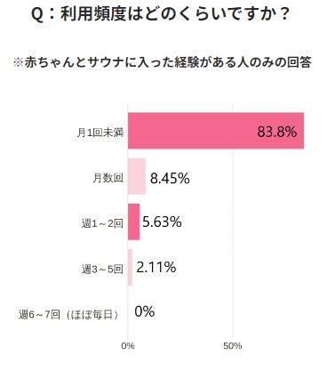 利用頻度としては月1回未満という回答が最も多く83.8%。週1以上利用するというかたは7.74%に留まりました。幼児の場合には月数回が17.5%であったため、幼児とのほうがより多くの頻度でサウナに行っていることがわかります。