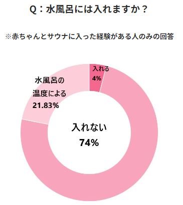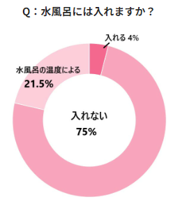 水風呂の利用に関しては74%以上が入れないと回答。入れるという場合でも、21.83%のかたは“水風呂の温度による”と回答しています。一方入れるというかたは4%ですが、幼児の場合はこれが18.13%で大きな差が出ました。
