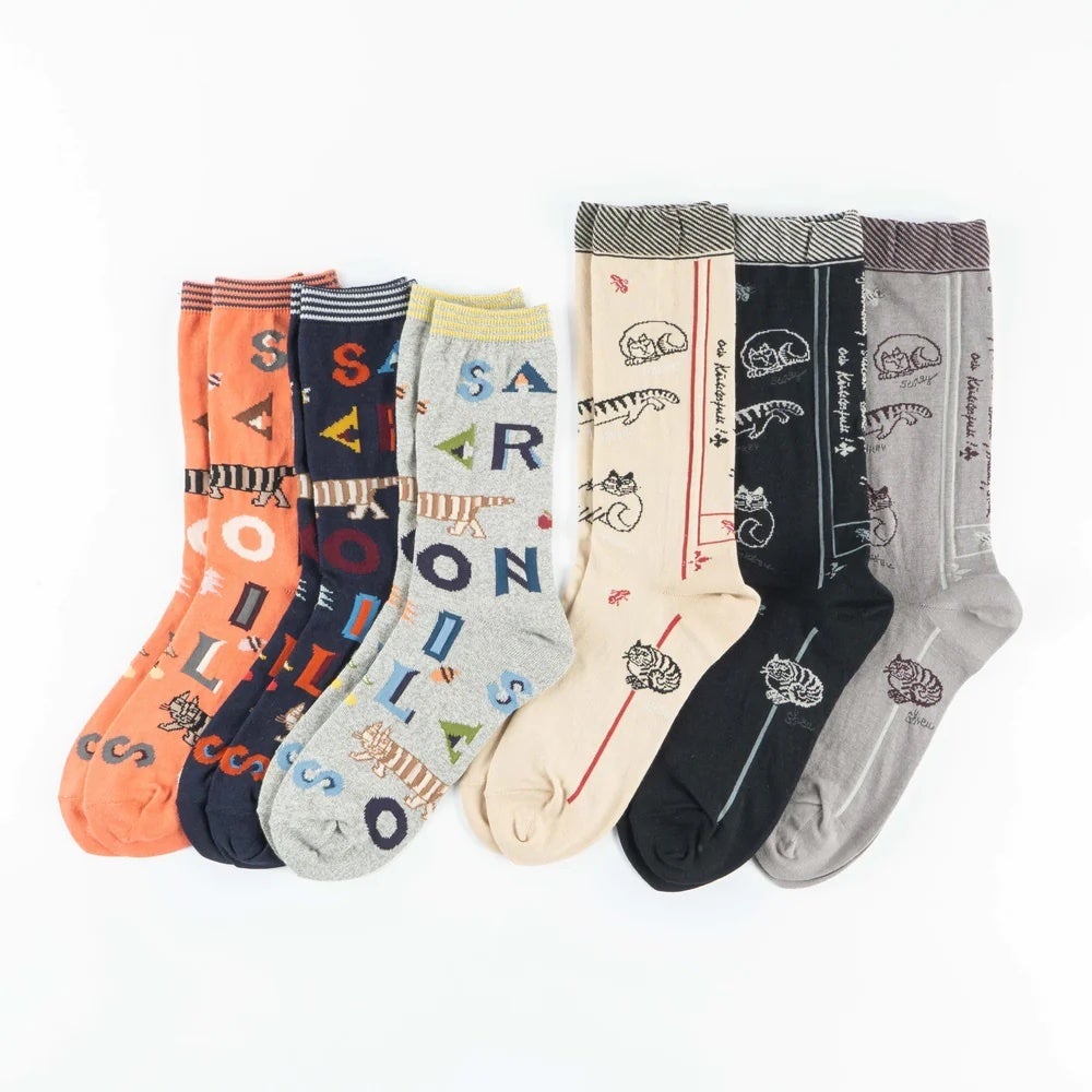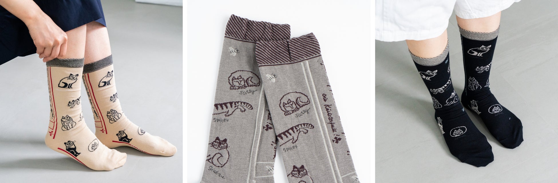 新作の「スケッチねこたち」3足セット、新色追加の「なまえの森」3足セット、全部まとめた贅沢6足セットも。その日の気分に合わせて、靴下のコーディネートをお楽しみいただけます。
