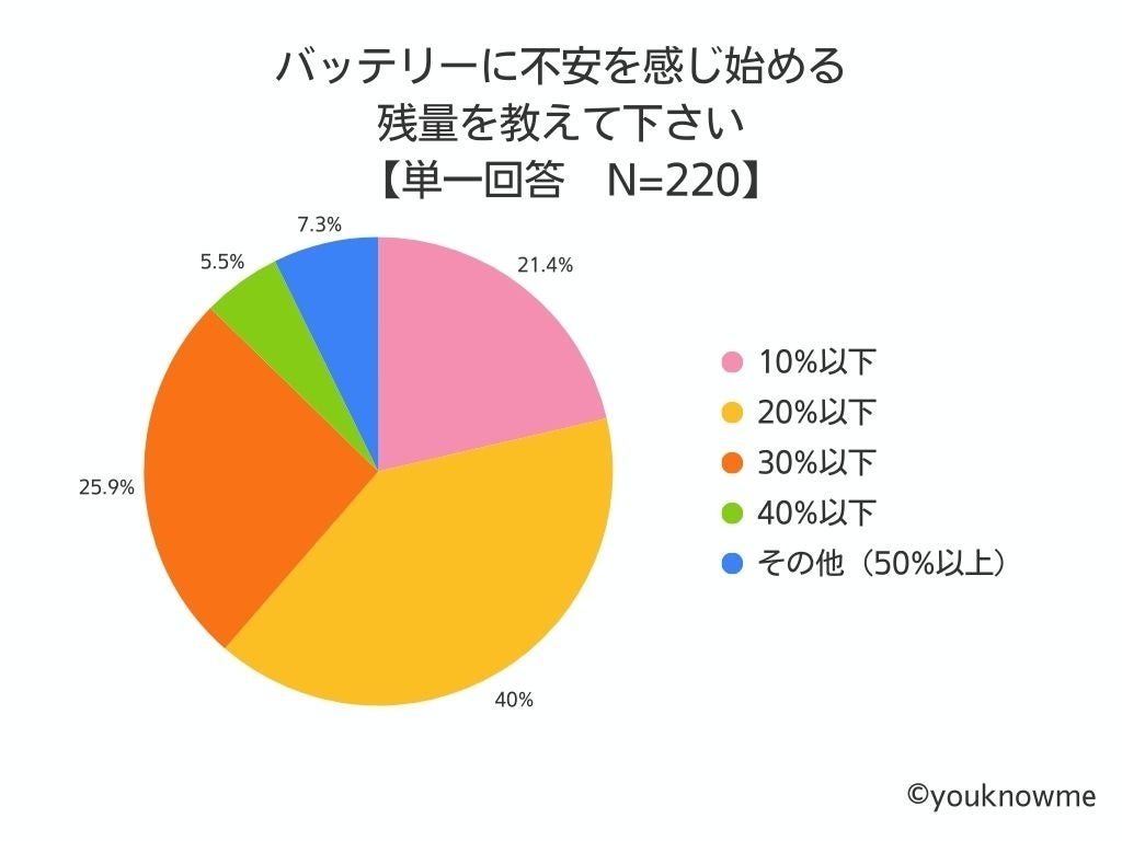 実際に、バッテリーに不安を感じ始める残量を聞いたところ、最も多かったのは「20%以下」。30%以下になると約4分の1以上の方々が不安になることがわかりました。