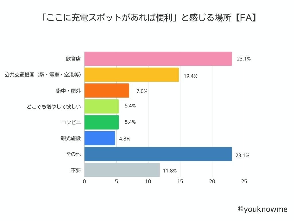 「ここに充電スポットがあれば便利」だと感じる場所がある人は約9割となり、「飲食店」(23.1%)、「公共交通(駅・電車内・空港等)」(19.4%)、に充電スポットを求める声が多くなりました。