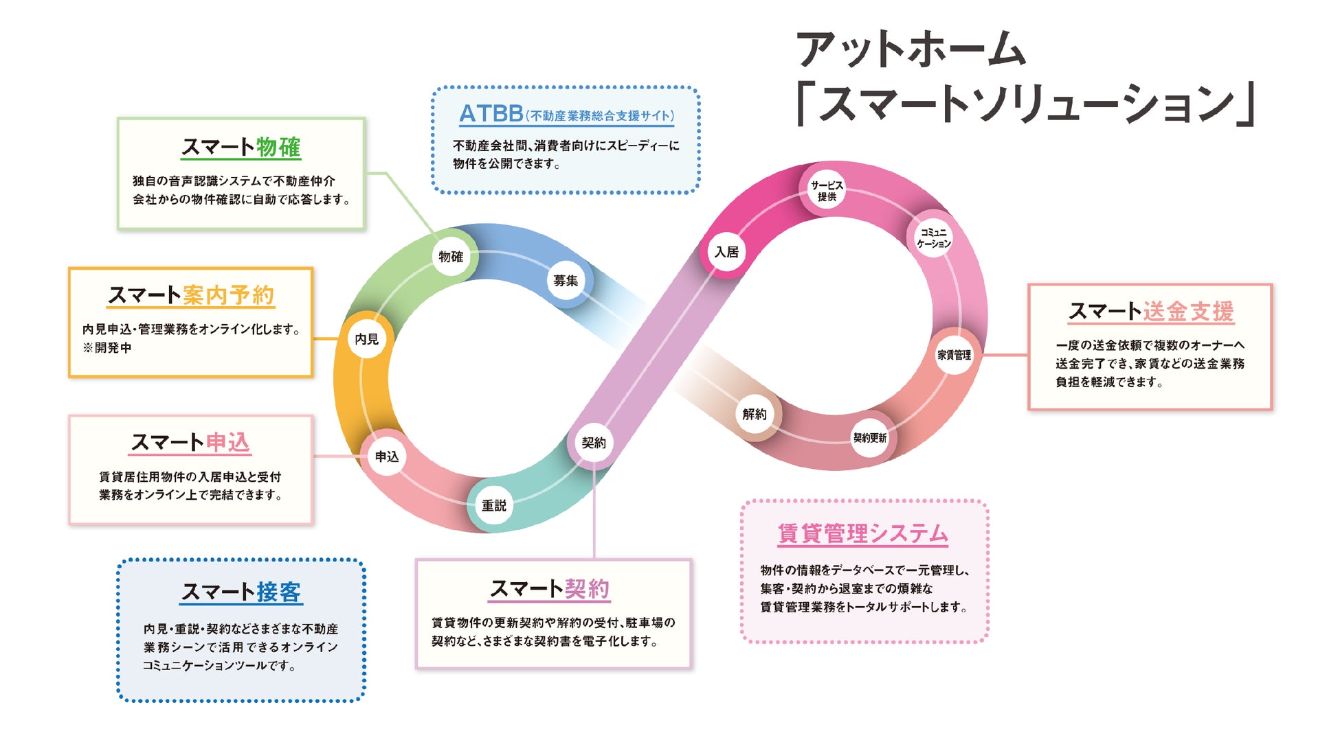 先端のテクノロジーを活用して、不動産業務の効率化・円滑化を実現し、不動産会社が接客などのコア業務に集中できる環境を提供するサービスです。物件の問合せから内見、申込、重要事項説明、契約の一連の業務をトータルにサポートし、日々の業務をよりスマートに変えていきます。