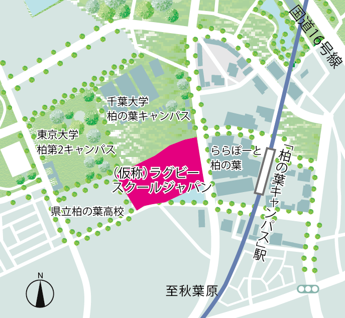 また、英国ラグビー校は球技種目であるラグビー発祥の地としても知られておりますが、競技生誕200年を迎える2023年に本校は開業する予定です。柏の葉とラグビーとの関わりは深く、「NECグリーンロケッツ東葛」のホストスタジアムがあり、ラグビーニュージーランド代表の事前キャンプサポートも過去には実施いたしました。「(仮称)Rugby School Japan(認可申請中)」の敷地内にも、国際規格のラグビー場を整備し、ラグビーを通じたスポーツ振興や国際化の推進、地域の活性化に繋げていきます。