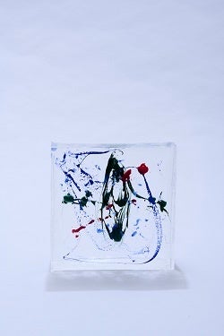 黒田征太郎氏の画風は、自由な線と色彩で描かれた生命力が特徴です。アトリエ、街中、旅先など場所を選ばず、クレヨン、鉛筆、ペン、水彩、油彩、木彫、エッチングなどさまざまな技法を用いて描く作品は30万点以上に上ります。アクリル作品は、黒田征太郎氏が、インテリアデザイナー倉俣史朗氏のアクリル製の名作椅子「ミス・ブランチ」に触発され、「アクリルという額の中に絵を入れたい」と思い立ったものです。アクリル樹脂で自身の絵や木彫など多彩な作品を固めたオブジェの制作を2016年より始め、新境地を開きました。堅牢で透明なアクリルは、光を閉じ込める、いわば透明な水の器です。
