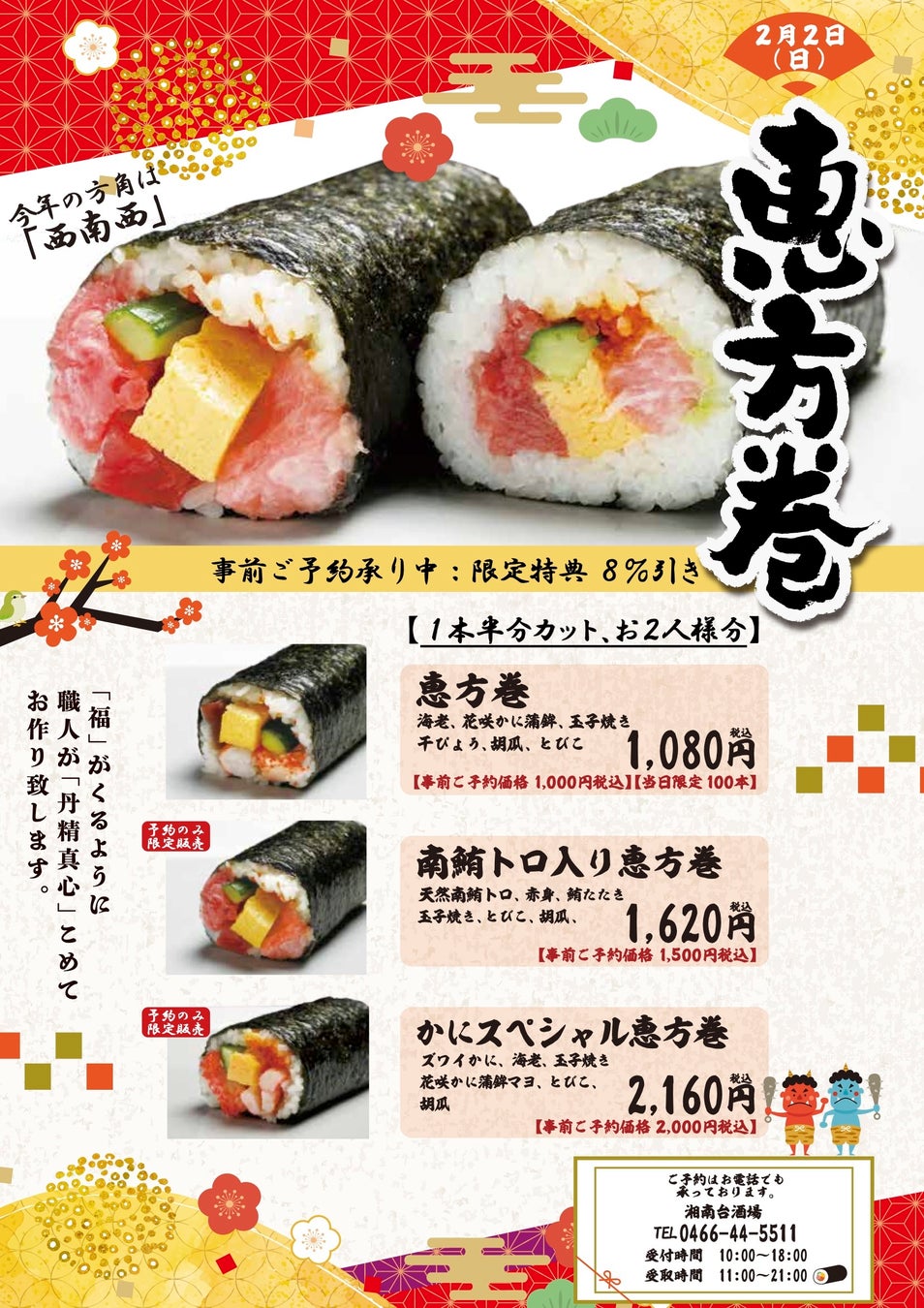 また今年は、事前に恵方巻のご注文をいただくと販売価格から8%引きでご提供いたします。