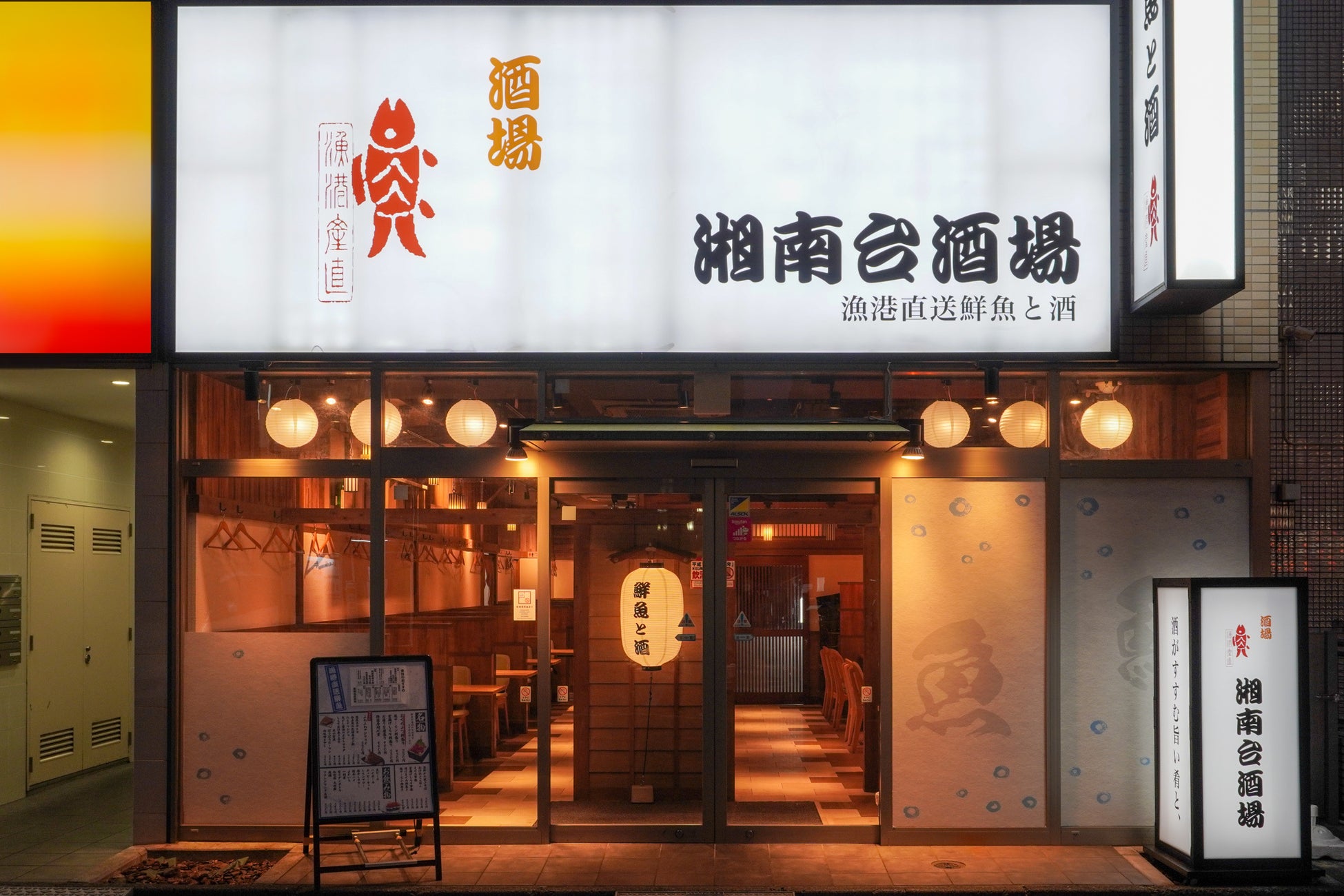 神奈川県藤沢市にある小田急・相鉄・横浜市営地下鉄「湘南台駅」西口より徒歩1分。地元に愛されるお店になるようにと、店名に湘南台の地名を冠した『湘南台酒場』。この店では「とる うる つくる 全部、SANKO」をスローガンに掲げ飲食業と水産業の両軸経営を行う当社の強みを生かし、自社船団「SANKO船団」で捕った魚をはじめ、沼津・浜松・豊洲のグループ会社の力を集結して仕入れた水産品を使った料理をメインにご提供しています。
