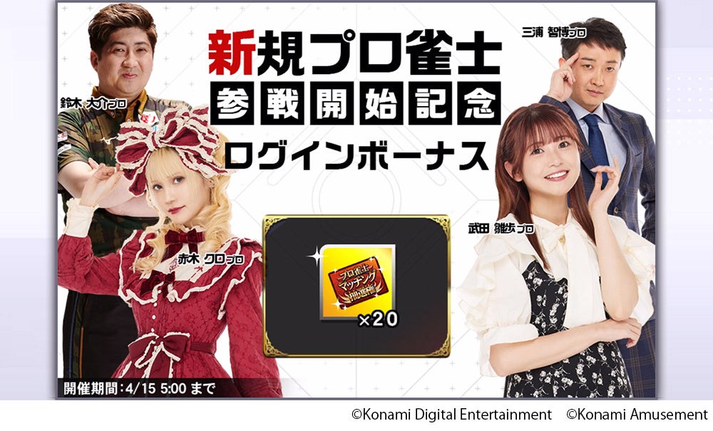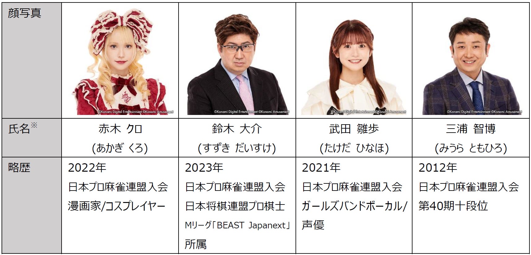 株式会社コナミアミューズメントは4月1日(月)に『麻雀格闘倶楽部 Extreme (マージャンファイトクラブ エクストリーム)』と『麻雀格闘倶楽部Sp (マージャンファイトクラブエスピー)』にて、日本プロ麻雀連盟のプロ雀士4人が追加参戦することをお知らせいたします。