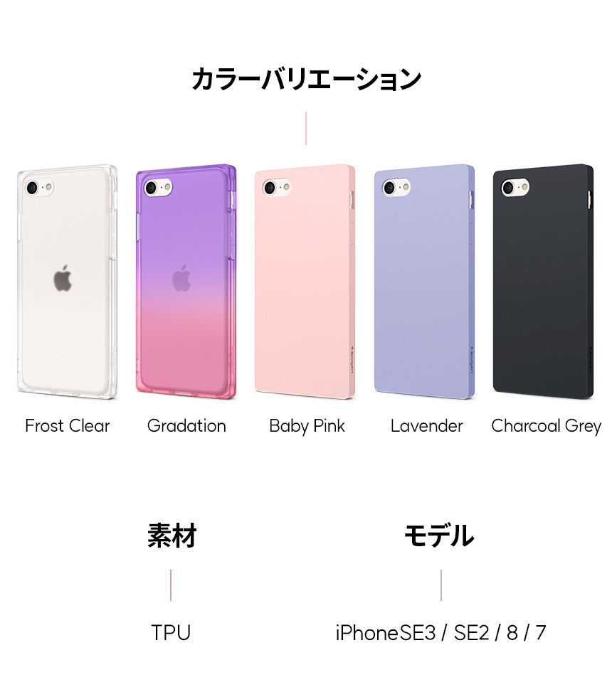 iPhone SE 第3世代 用 ケース「リ・メロー」のカラーは、フロスト・クリア、チャコール・グレー、グラデーション、ベビー・ピンク、ラベンダー の全5色です。
