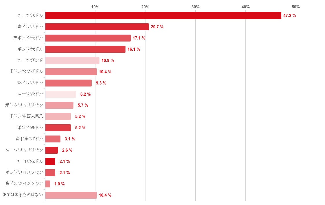 「ユーロ/米ドル」が47.2%で圧倒的な人気を集め、ついで「豪ドル/米ドル」が20.7%で続いた。