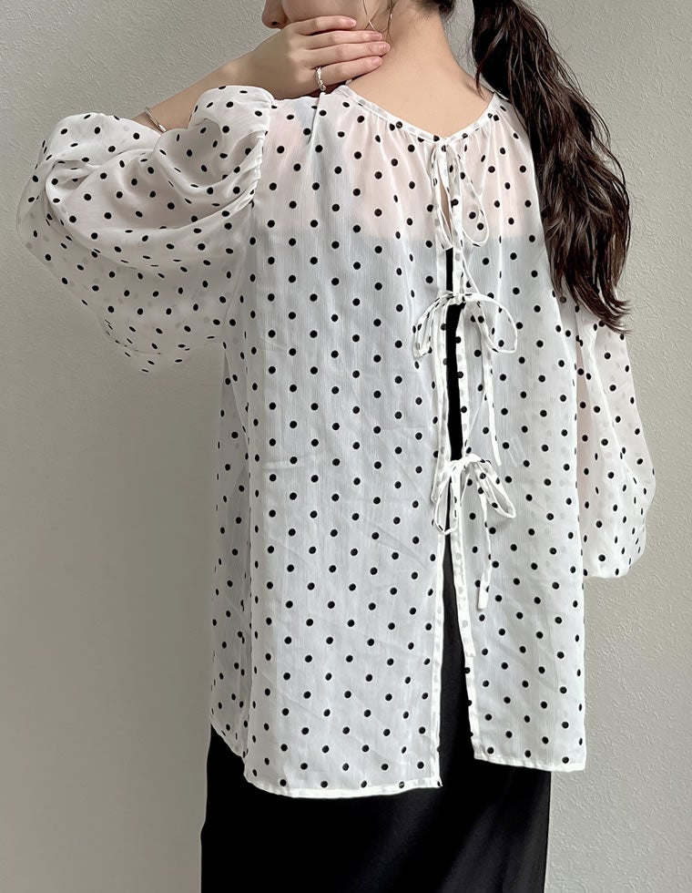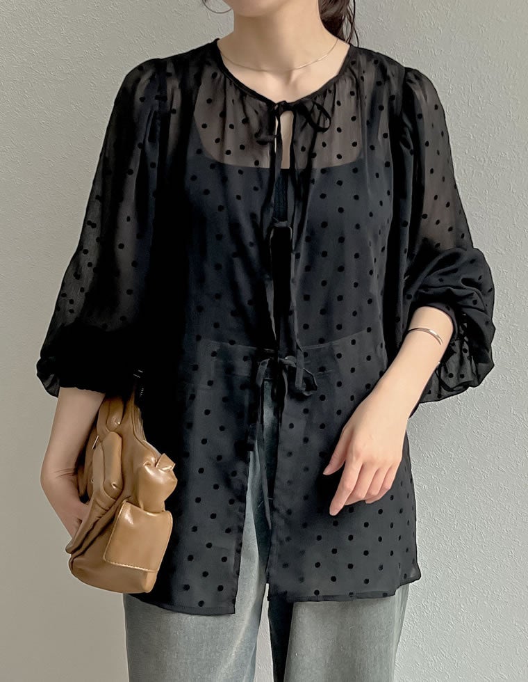 商品名:2WAY無地orフロッキードット柄シアー楊柳ボリュームスリーブブラウス