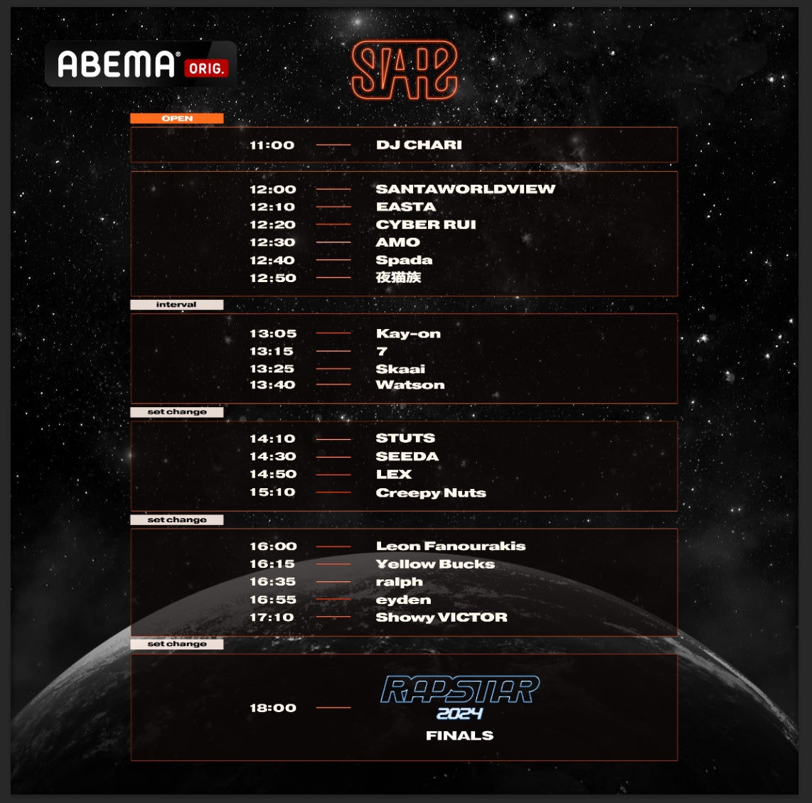 新しい未来のテレビ「ABEMA(アベマ)」が、2024年6月29日(土)に幕張メッセ国際展示場にて開催する次世代ラッパーを発掘するオーディションプロジェクト番組『ラップスタア 2024』によるHIPHOPフェス『STARZ』において、イベント当日のタイムテーブルを発表いたします。