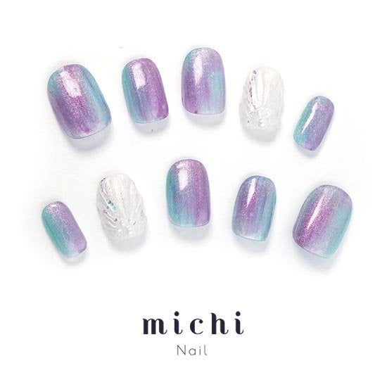 ブルーとパープルの縦グラデにラメが輝くマーメイドネイルです。夏の定番シェルネイルの下にはパールが飾られていて上品な雰囲気です。涼しげなカラーとシェルネイルを上品に楽しめる夏のおすすめネイルです。