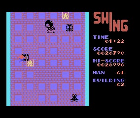 本作は1985年にリリースされたアクションゲーム。プレイヤーは主人公のスイングくんを操作して、ビルの汚れた窓をキレイにしていきます。窓拭きでの移動は隣接する窓から窓へのみといった制限があり、邪魔する様々なモンスターも登場してプレイは忙しいものとなります。またボーナスとなる妖精、時々出現するメロディーちゃんで無敵を駆使して効率よく窓拭きをしましょう。全ての窓をきれいにしたら1階のビルの入口に行くとステージクリアとなります。