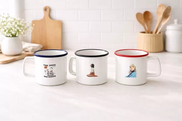 ME-Qなら、レトロでほっこり可愛い“ホーロー風”デザインの陶器マグカップが1個から作成可能!UV-DTFプリント対応で、貼るだけ簡単にオリジナルマグが完成。ノベルティ・記念品にもおすすめです。