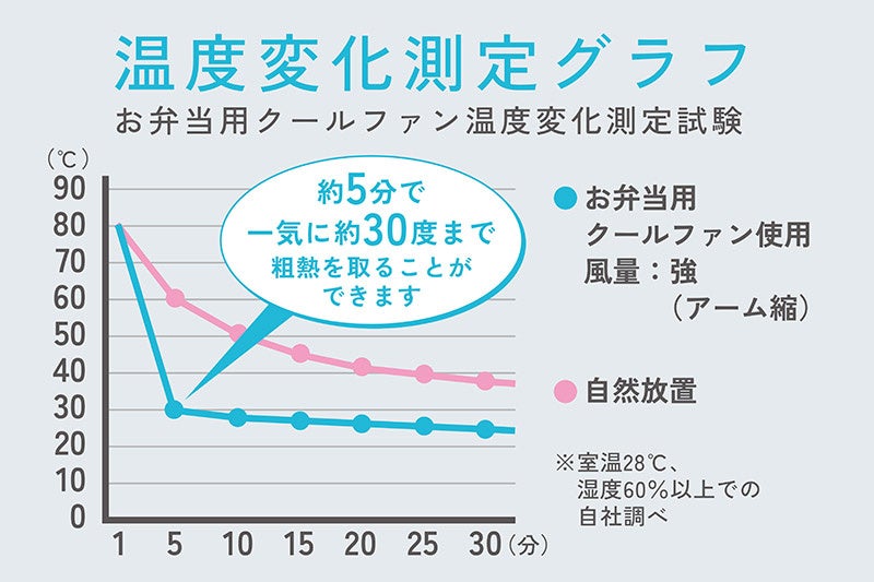 お弁当用クールファン使用の場合5分で約28℃まで下がり、粗熱が取れます。