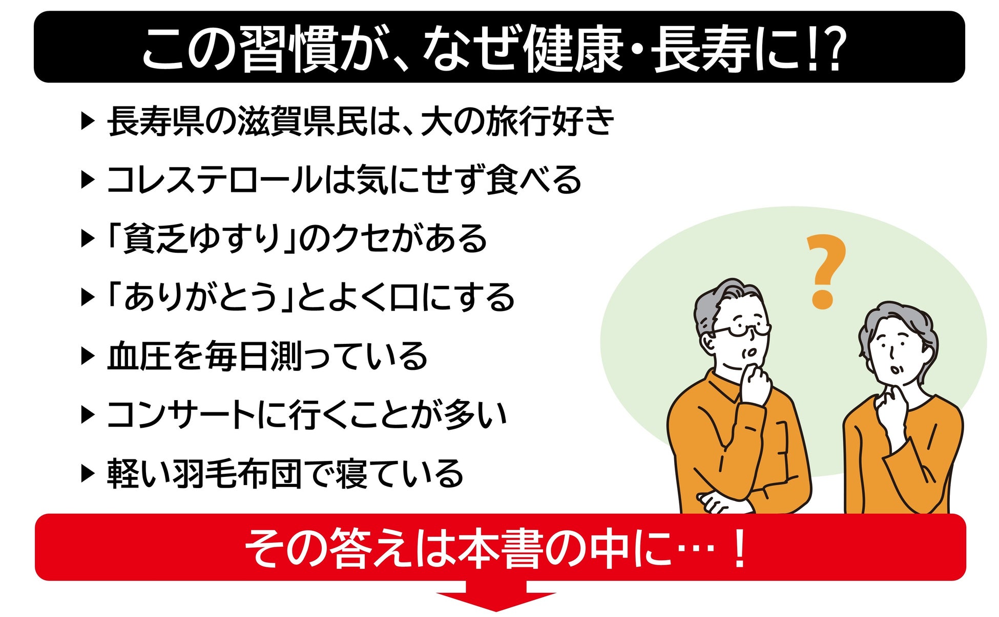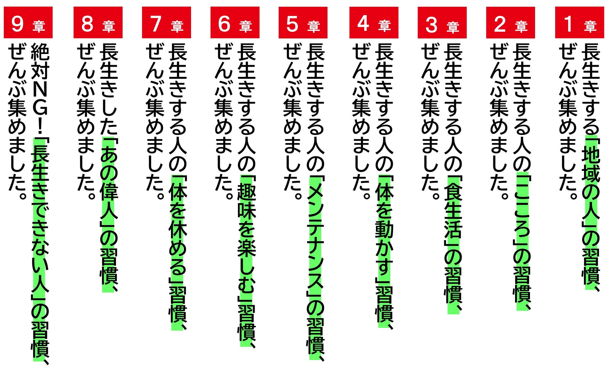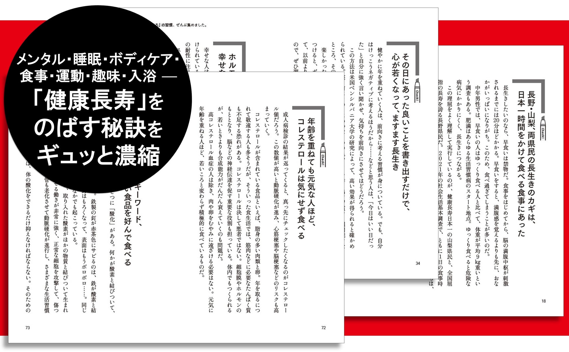 本書では、健康的な食生活のポイントはもちろん、心を穏やかに保つコツ、体を上手に動かし、休ませ、メンテナンスするための要領、長寿地域に暮らす人々に見習うべき生活習慣、長生きした偉人らに学ぶこだわりなど、幅広