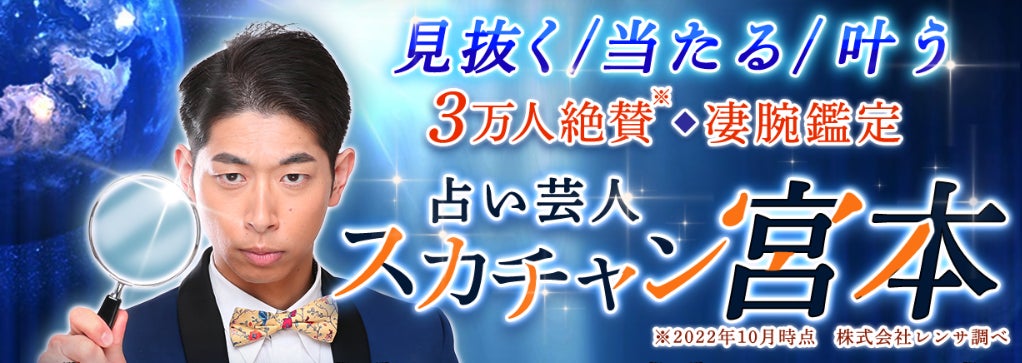 本サイトは、人気芸能人が“ここまで当たるか”と絶賛する占い芸人『スカチャン宮本』による本格鑑定です。長年の鑑定経験と豊富な知識によって導き出された、スカチャン宮本“独自の鑑定法”で相談者の「名前」と「生年月日」から見えた運命を覗き込んでいきます。そこに現れたイメージから生まれ持った特質やあの人との恋宿命、そして未来に起こる出来事や時期までもハッキリと分かりやすくお伝えしていきます。