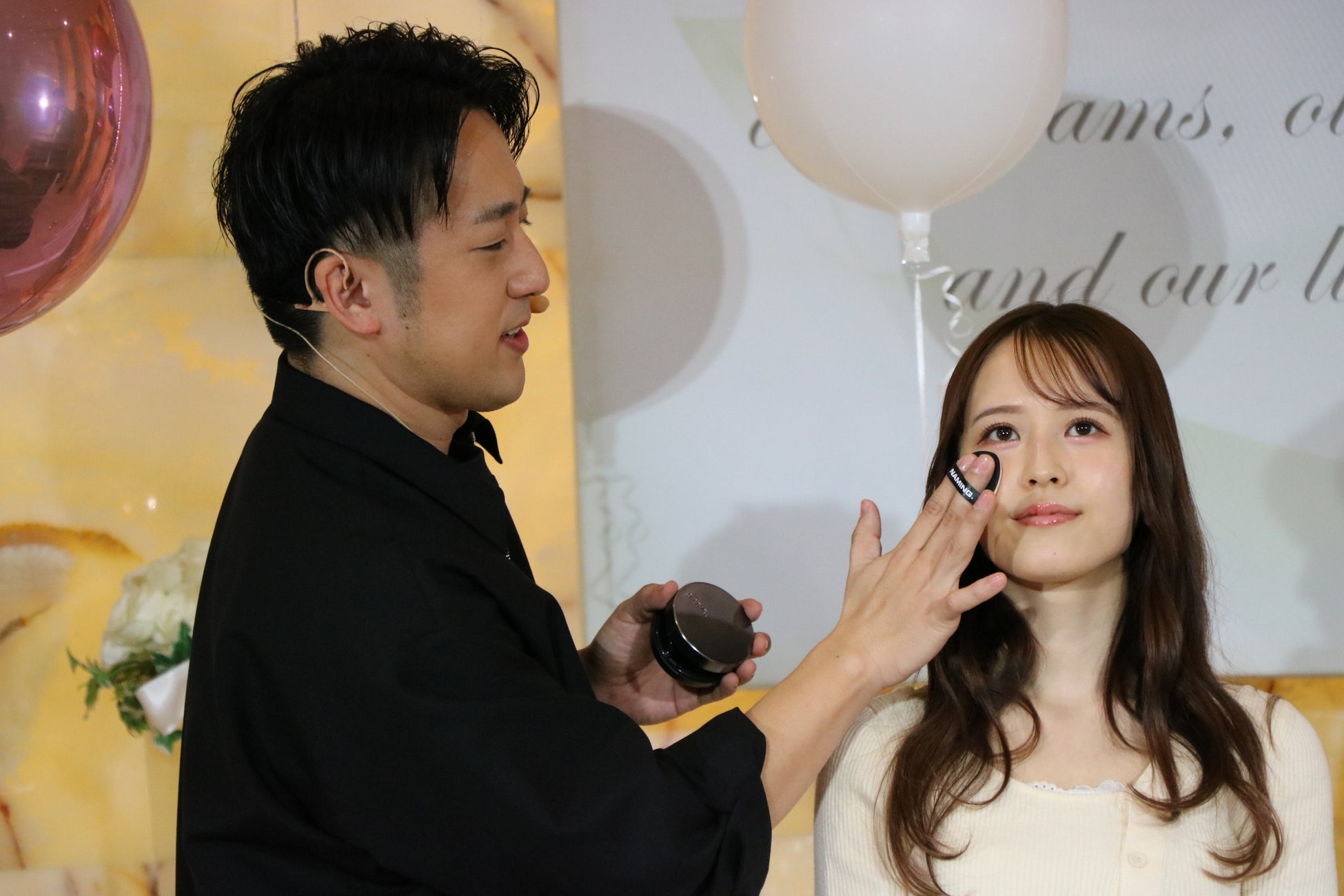 続いて登場したのは、ヘアメイクアップアーティストの佐々木一憲さんです。誰でも簡単に真似できるメイクテクニックに池田さんも注目しているという佐々木さんが披露してくれたのは、ご自身がメイクアップアンバサダーを務める「NAMING.」の新商品であるクリームチークと人気のパウダーチークを使ったメイク。異なる質感のチークを重ねて、洒落感のあるニュアンスや奥行きを演出するメイク術を実演。その重ねる順番や色の組み合わせに、ジャンボさんが「先にパウダーかぁ」と興味津々な様子をみせる中、会場の観覧者も熱心に撮影する姿が見られました。