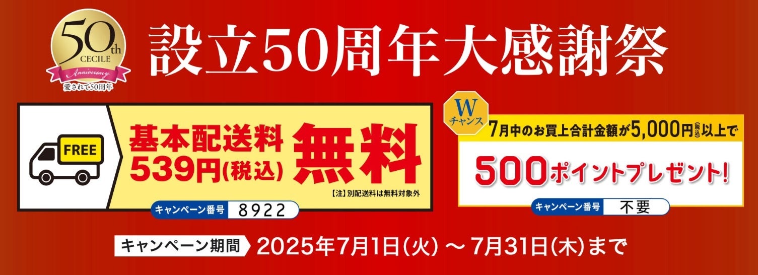セシールは2024年8月に設立50周年を迎えました。設立50周年を飾るグランドフィナーレとして、お買上金額にかかわらず基本配送料<539円(税込)>無料キャンペーンを実施!さらにWチャンスで、7月中のお買上金額合計5,000円(税込)以上で500ポイントプレゼント。
