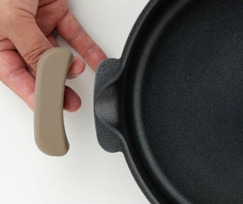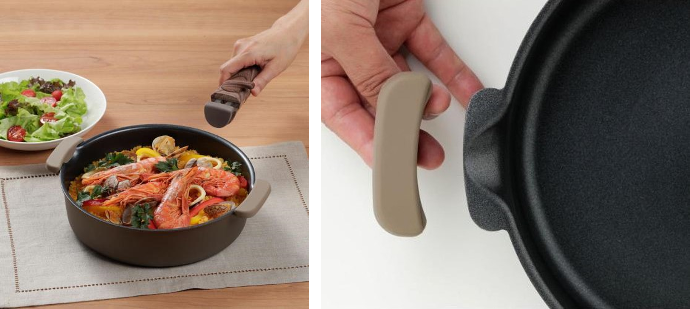 今回発売される2製品は、鍋の取っ手部分が取り外し可能となっています。取っ手を取り付ければ熱い鍋をそのまま食卓に出すことができ、外せば食器洗浄機でのお手入れも可能です。