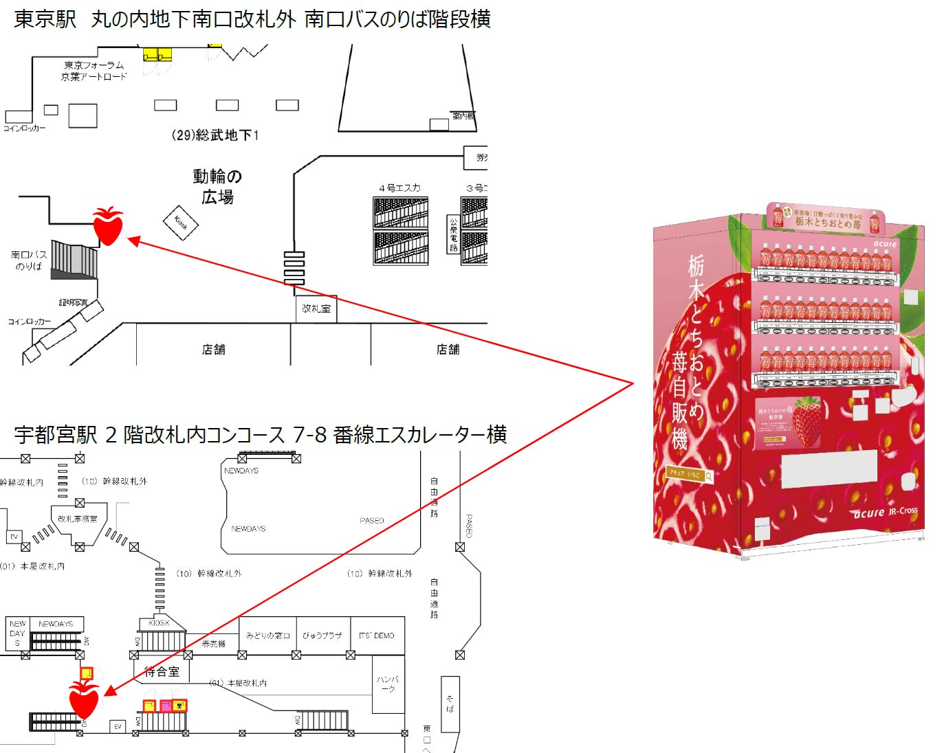 ・同商品の発売を記念して、2023年3月7日(火)から東京駅と宇都宮駅にいちごドリンク専用自販機を設置します。また、2023年3月15日(水)~17日(金)の期間、東京駅構内のスクエアゼロで開催される栃木県産いちごやいちご関連商品のフェア内でも、同商品が販売されます。