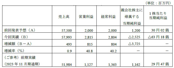 2024年11月期の通期連結業績については、売上高は概ね前回予想通りとなりました。