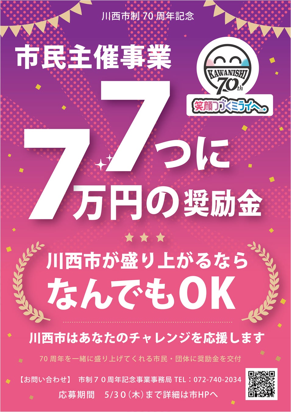 川西市では、令和6年8月1日に市制施行から70年を迎えるにあたり、70周年を一緒に祝い、盛り上げてくれる事業を募集。