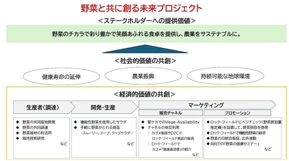 ロック・フィールドとカゴメは、2017年より「Social Good Collaboration」の理念を共有し、野菜の彩りやおいしさ、栄養価を最大限に活かした商品の共同開発を通じて、生活者の健康寿命の延伸を目指してきました。昨今の野菜を取り巻く環境は大きく変化し、ライフスタイルの変化により食の簡便化や野菜を調理する手間を避ける傾向が高まり、さらに、生産者の高齢化や減少、異常気象の影響による生鮮野菜高騰など、野菜を楽しむ時間や野菜の摂り方・摂取量に大きな影響を与えていると考えられます。このような状況の中で、「健康寿命の延伸」に向けた協業をさらに強化させ、「農業振興」や「持続可能な地球環境」の実現にも貢献していきたいと考え、業務提携契約の締結を行い、『野菜と共に創る未来プロジェクト』を立ち上げました。このプロジェクトでは、「健康寿命の延伸」だけでなく、「農業振興」や「持続可能な地球環境」といった社会的価値を追求しながら、双方の経済的価値も同時に高め、生産者・消費者といったステークホルダーへの提供価値「野菜のチカラで彩り豊かで笑顔あふれる食卓を提供し、農業をサステナブルに。」を目指します。このプロジェクトでは、異業種の業務提携という利点を活かし、従来の「商品の共同開発」での協業から、生産者(調達)、開発・生産、販売チャネル、プロモーションといった「バリューチェーン全体にわたる協業」へと発展させていきます。