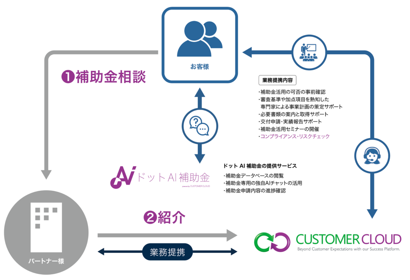 パートナー企業がお客様から補助金申請に関するご相談を承った際、お客様の同意を得てカスタマークラウドの専門家による申請支援サービスをご紹介いたします。