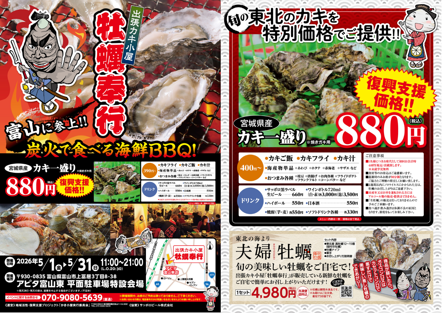 富山県富山市に「出張カキ小屋」参上! 5月1日〜期間限定開催!《 宮城県産殻付き牡蠣が一盛り880円!! 》