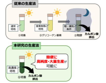 過去に報告された生産法では、①明所で培養、②細胞を窒素を制限した培地に移してグリコーゲンを蓄積、③暗所・無酸素条件(発酵条件)という3工程を経てカルボン酸を生産します(上図)。一方、本研究での生産法は、①明所で培養のみの1工程で、カルボン酸を高純度で大量生産が可能です(下図)。