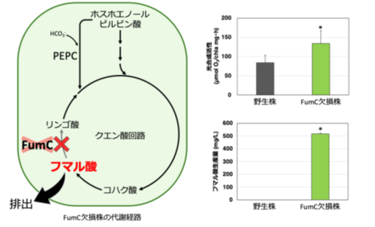 本研究グループは、まずシネコシスティスの野生株とFumC欠損株を明好気条件下で培養しました。その結果、FumC欠損株は野生株と比較して光合成活性が向上しており、さらにFumC欠損株においてのみフマル酸が細胞外へ排出されることを確認しました(図2)。