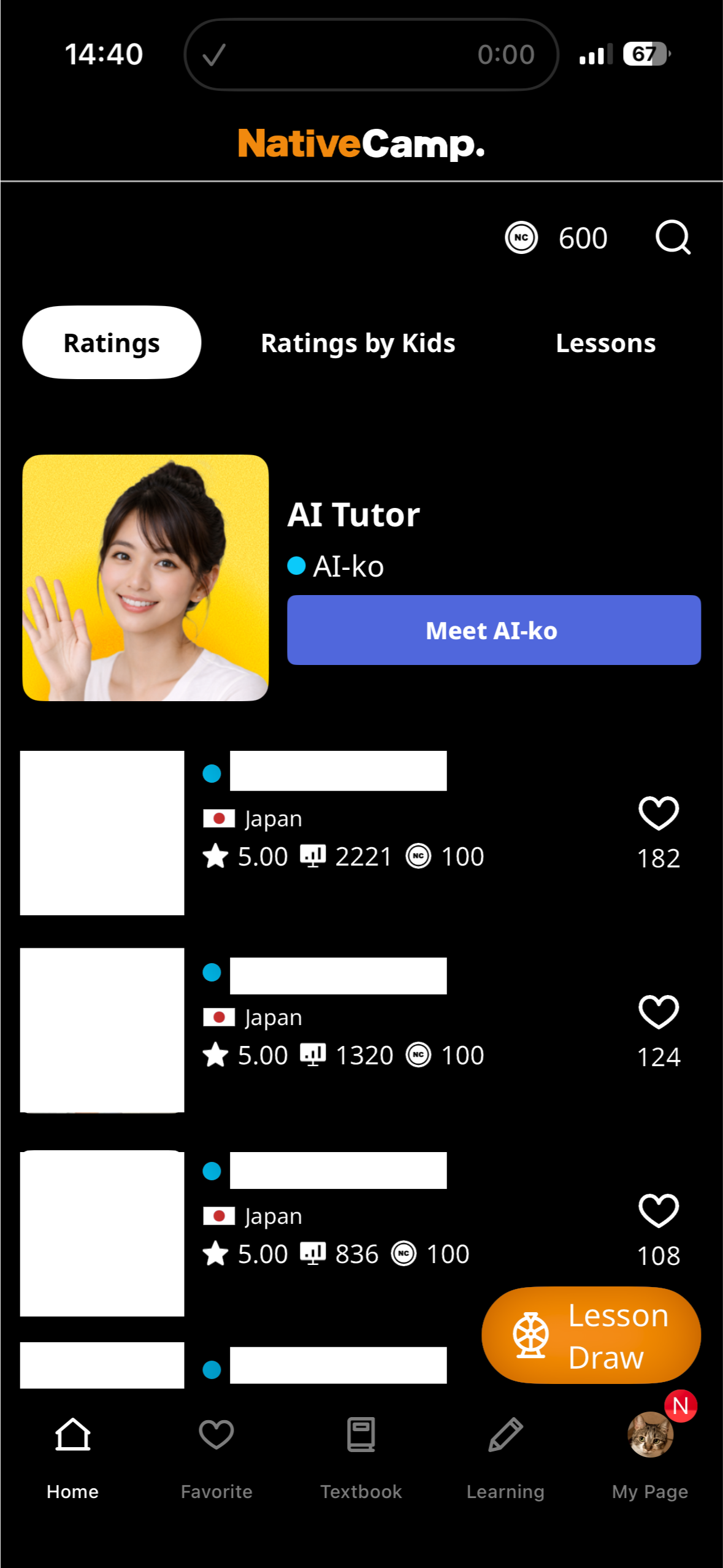 アプリを開き、講師一覧の一番上に表示されているAI日本語講師「AI-ko」 をタップするだけで、日本語会話を開始できます。