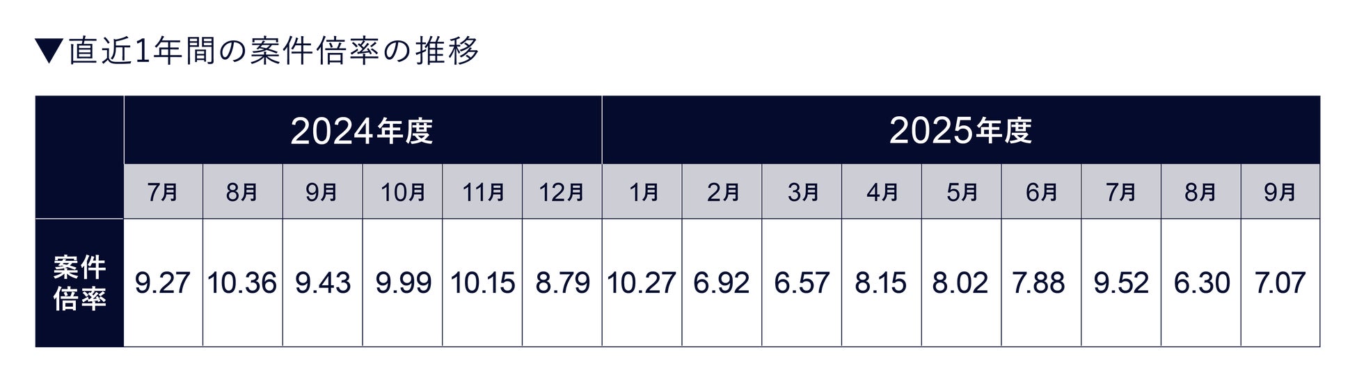 2025年7月から9月において、案件数・案件を探すフリーランスともに、前四半期よりも増加し、案件倍率は、7月:9.52倍、8月:6.30倍、9月:7.07倍、四半期累計では7.53倍となりました。