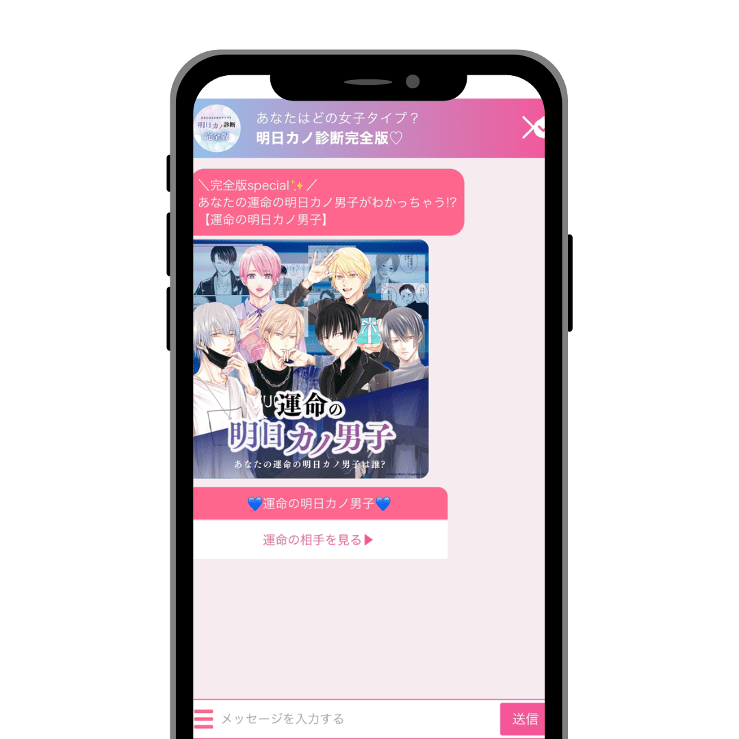 「運命の明日カノ男子」は、チャット画面の固定メニューをタップするか、チャット画面で「運命」と送ると診断が始まります。